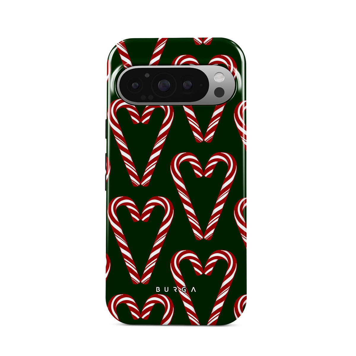 Vibrant and playful, our Candy Cane Google Pixel 9 Pro Case phone case design showcases candy cane heart motifs against a dark green background—a delightful choice for those who love a touch of whimsy and nostalgia.