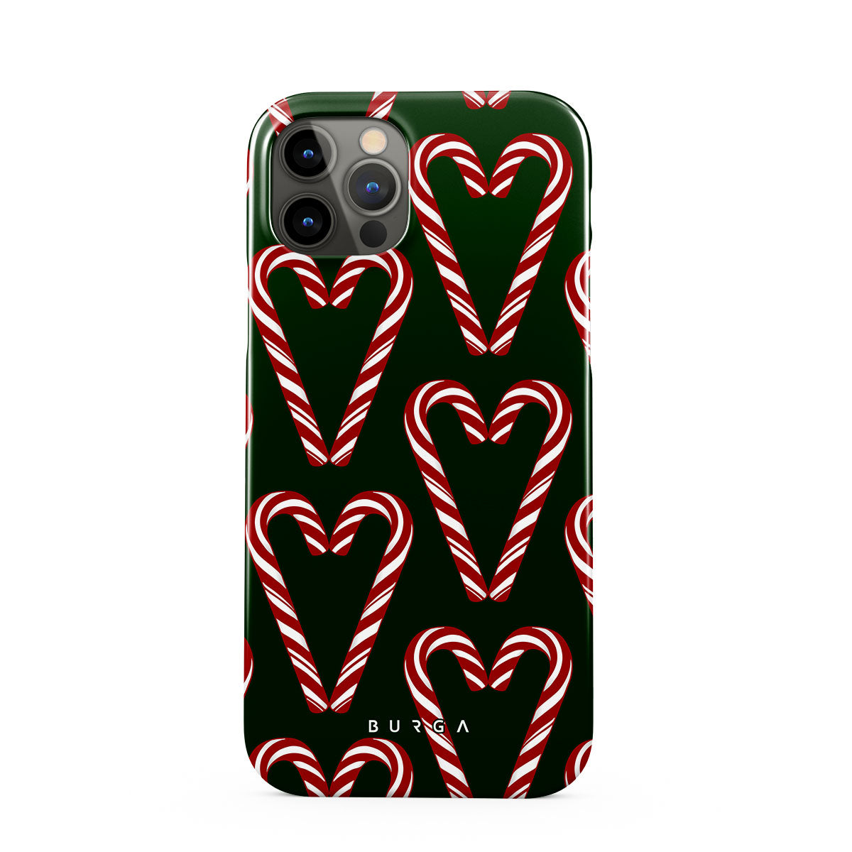 Vibrant and playful, our Candy Cane iPhone 12 Pro Max Case phone case design showcases candy cane heart motifs against a dark green background—a delightful choice for those who love a touch of whimsy and nostalgia.