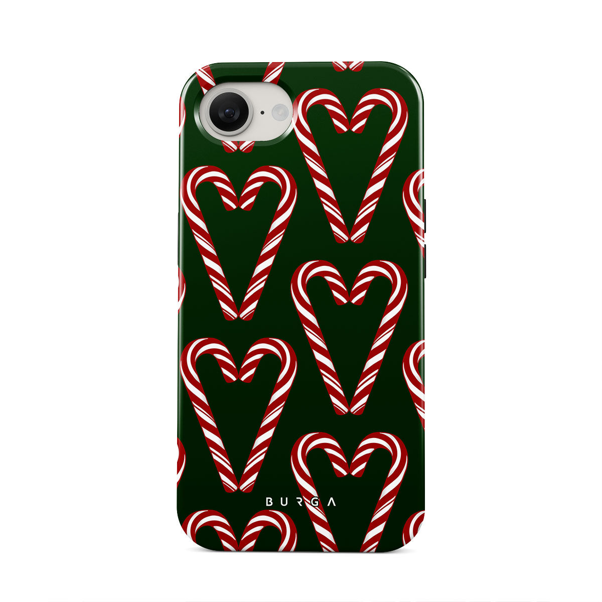 Vibrant and playful, our Candy Cane iPhone 16e Case phone case design showcases candy cane heart motifs against a dark green background—a delightful choice for those who love a touch of whimsy and nostalgia.
