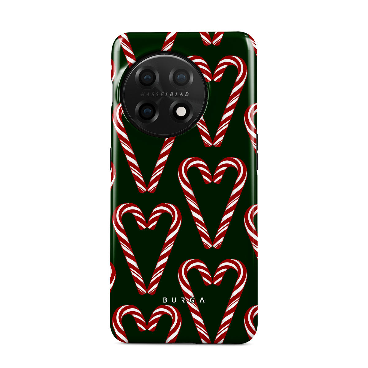 Vibrant and playful, our Candy Cane OnePlus 11 Case phone case design showcases candy cane heart motifs against a dark green background—a delightful choice for those who love a touch of whimsy and nostalgia.