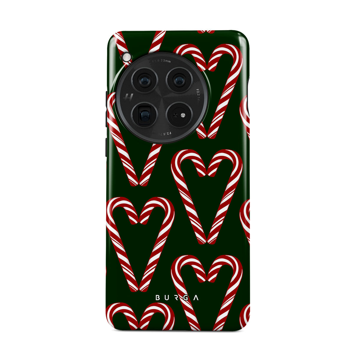 Vibrant and playful, our Candy Cane OnePlus 12 Case phone case design showcases candy cane heart motifs against a dark green background—a delightful choice for those who love a touch of whimsy and nostalgia.