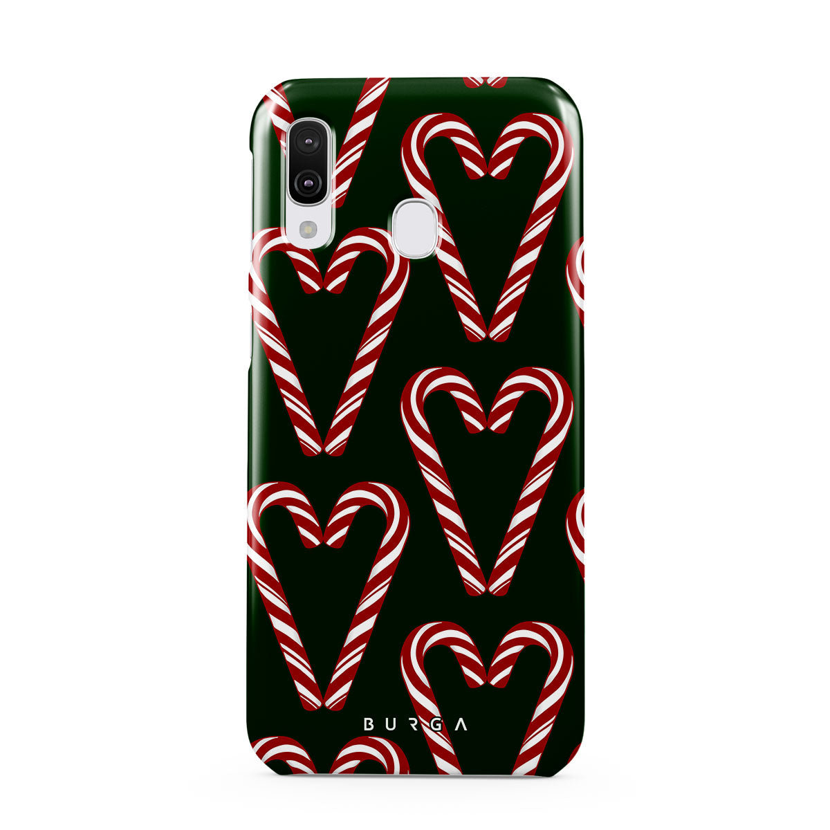 Vibrant and playful, our Candy Cane Samsung Galaxy A40 Case phone case design showcases candy cane heart motifs against a dark green background—a delightful choice for those who love a touch of whimsy and nostalgia.