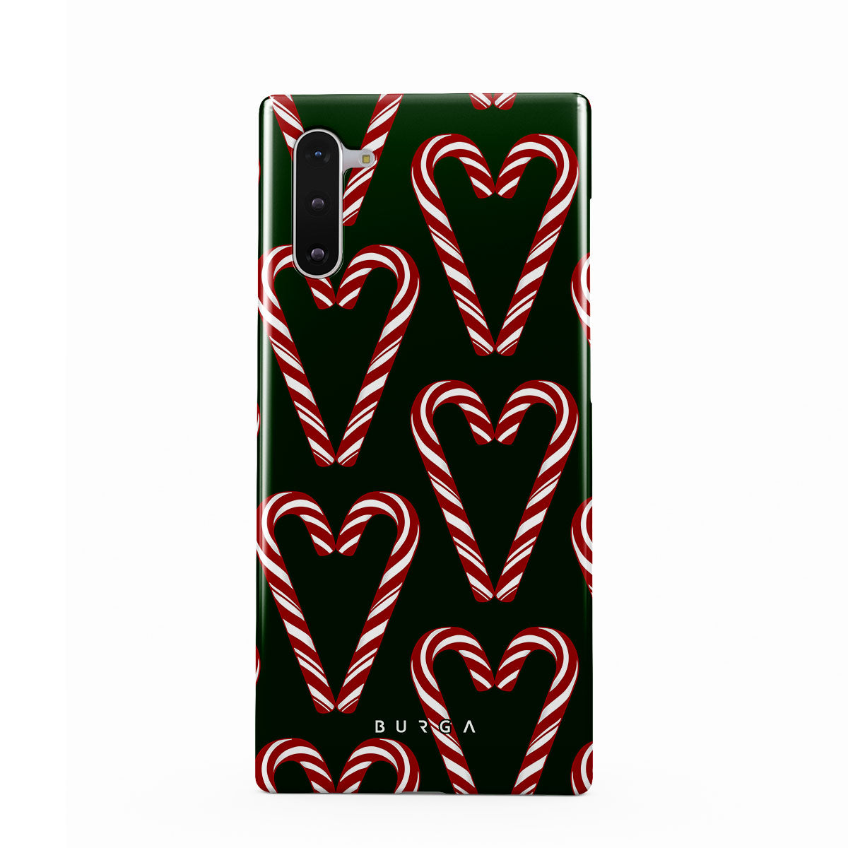 Vibrant and playful, our Candy Cane Samsung Galaxy Note 10 Case phone case design showcases candy cane heart motifs against a dark green background—a delightful choice for those who love a touch of whimsy and nostalgia.