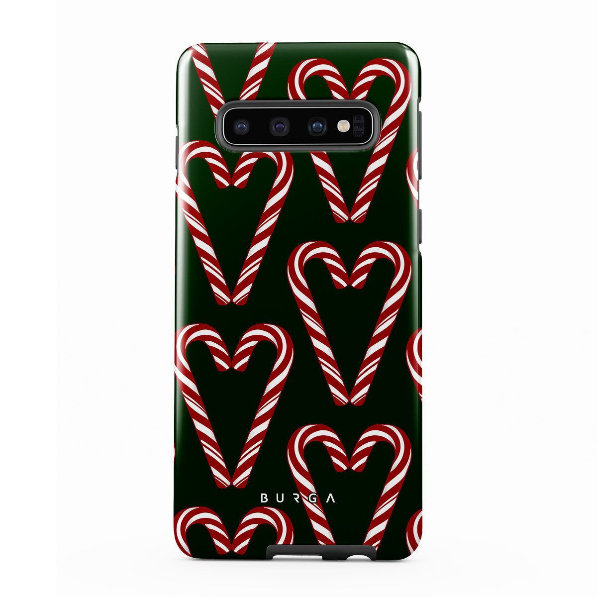 Vibrant and playful, our Candy Cane Samsung Galaxy S10 4G Case phone case design showcases candy cane heart motifs against a dark green background—a delightful choice for those who love a touch of whimsy and nostalgia.