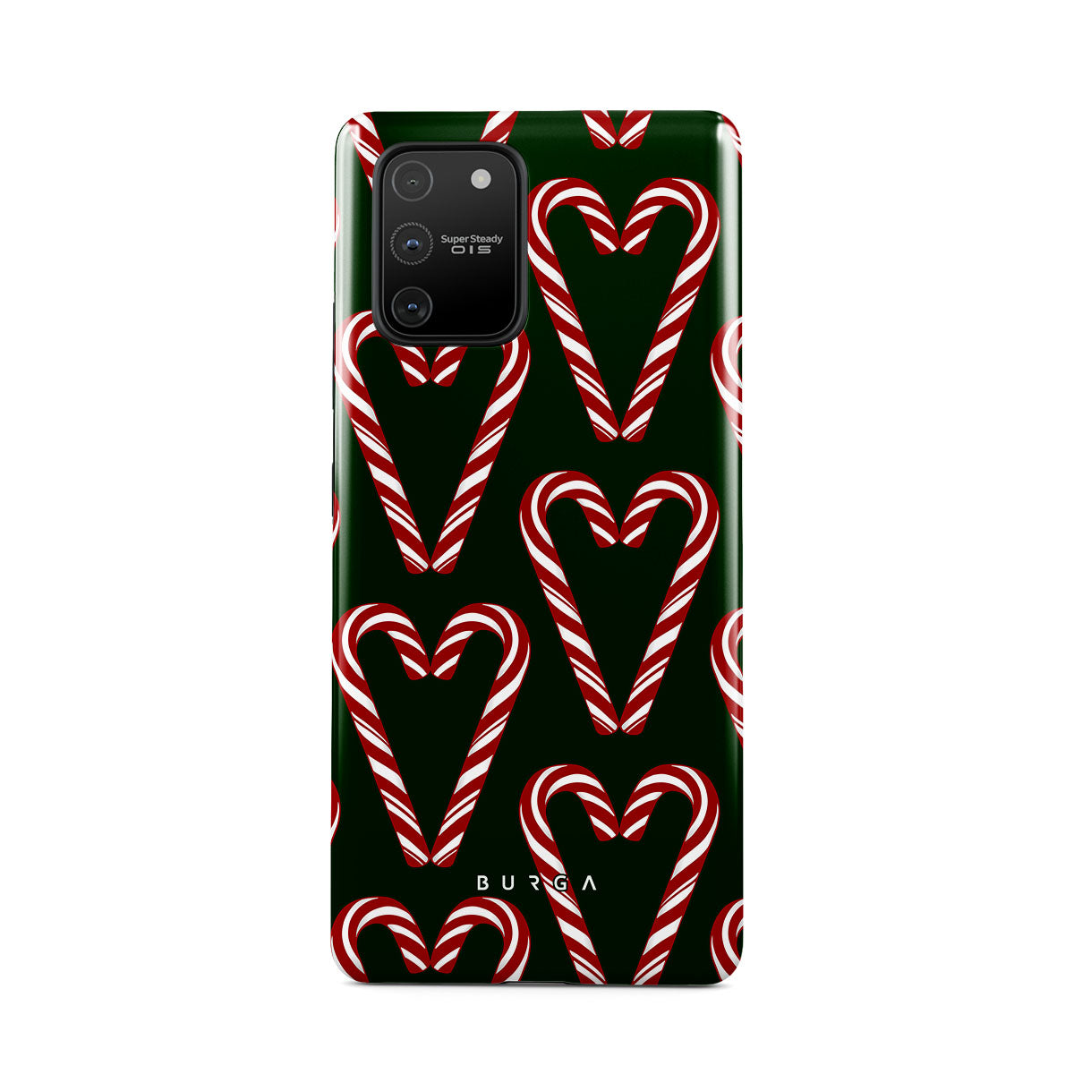Vibrant and playful, our Candy Cane Samsung Galaxy S10 Lite Case phone case design showcases candy cane heart motifs against a dark green background—a delightful choice for those who love a touch of whimsy and nostalgia.