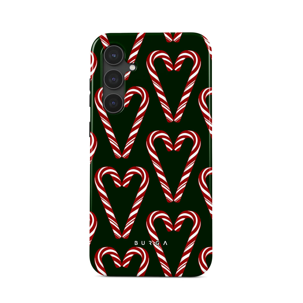 Vibrant and playful, our Candy Cane Samsung Galaxy S23 FE Case phone case design showcases candy cane heart motifs against a dark green background—a delightful choice for those who love a touch of whimsy and nostalgia.