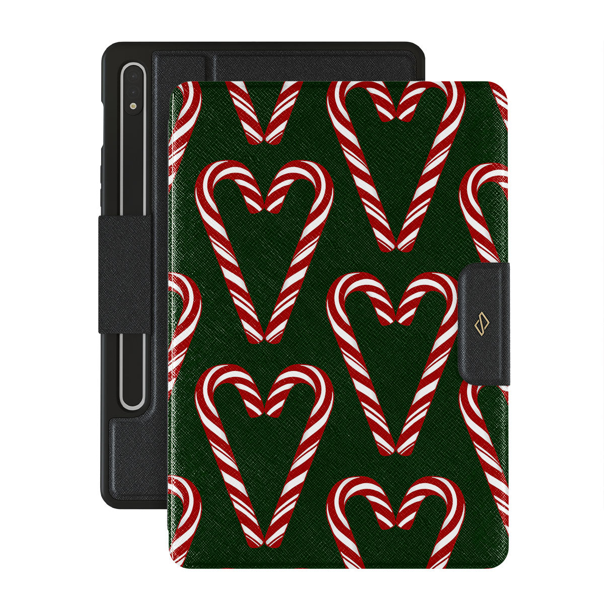 Vibrant and playful, our Candy Cane Samsung Galaxy Tab S10+ folio case design showcases candy cane heart motifs against a dark green background—a delightful choice for those who love a touch of whimsy and nostalgia.