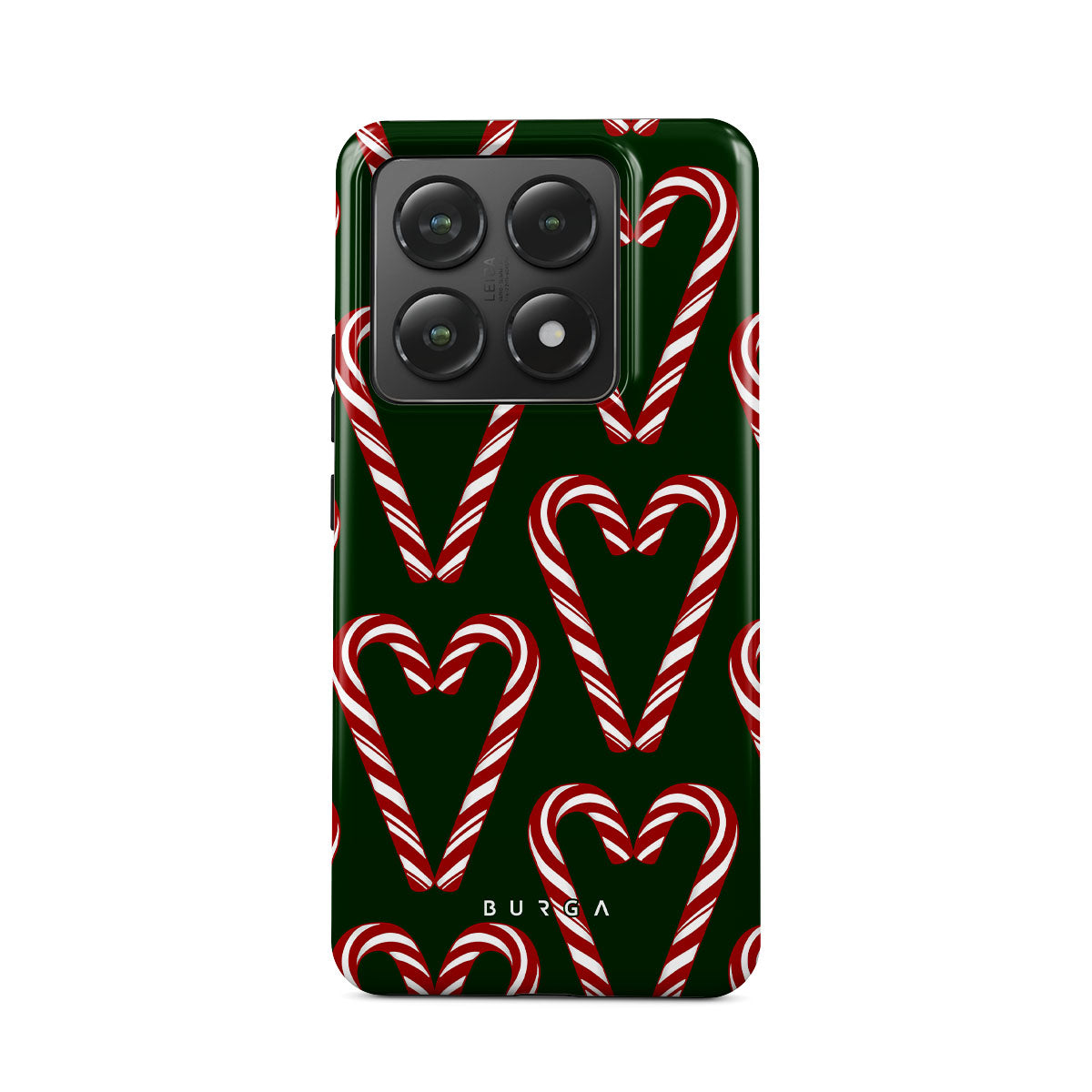 Vibrant and playful, our Candy Cane Xiaomi 14T Pro Case phone case design showcases candy cane heart motifs against a dark green background—a delightful choice for those who love a touch of whimsy and nostalgia.