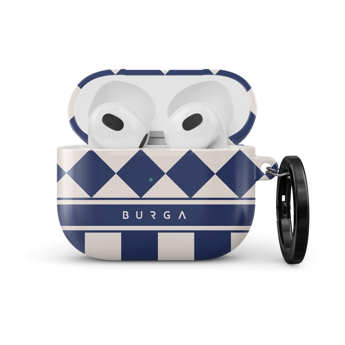 Embrace the essence of subtle luxury with our Check & Mate Apple Airpods 3 case cover design. Blending eggshell and deep blue checkers, it evokes whispers of elegance. While diamonds grace the upper half, the lower half features a timeless chessboard pattern.