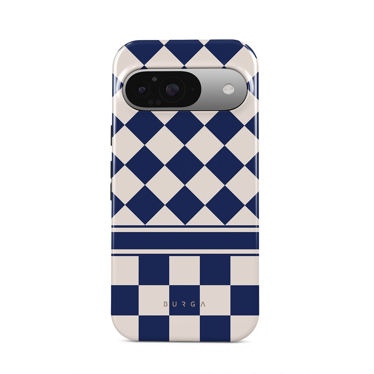 Embrace the essence of subtle luxury with our Check & Mate Google Pixel 9 phone case design. Blending eggshell and deep blue checkers, it evokes whispers of elegance. While diamonds grace the upper half, the lower half features a timeless chessboard pattern.