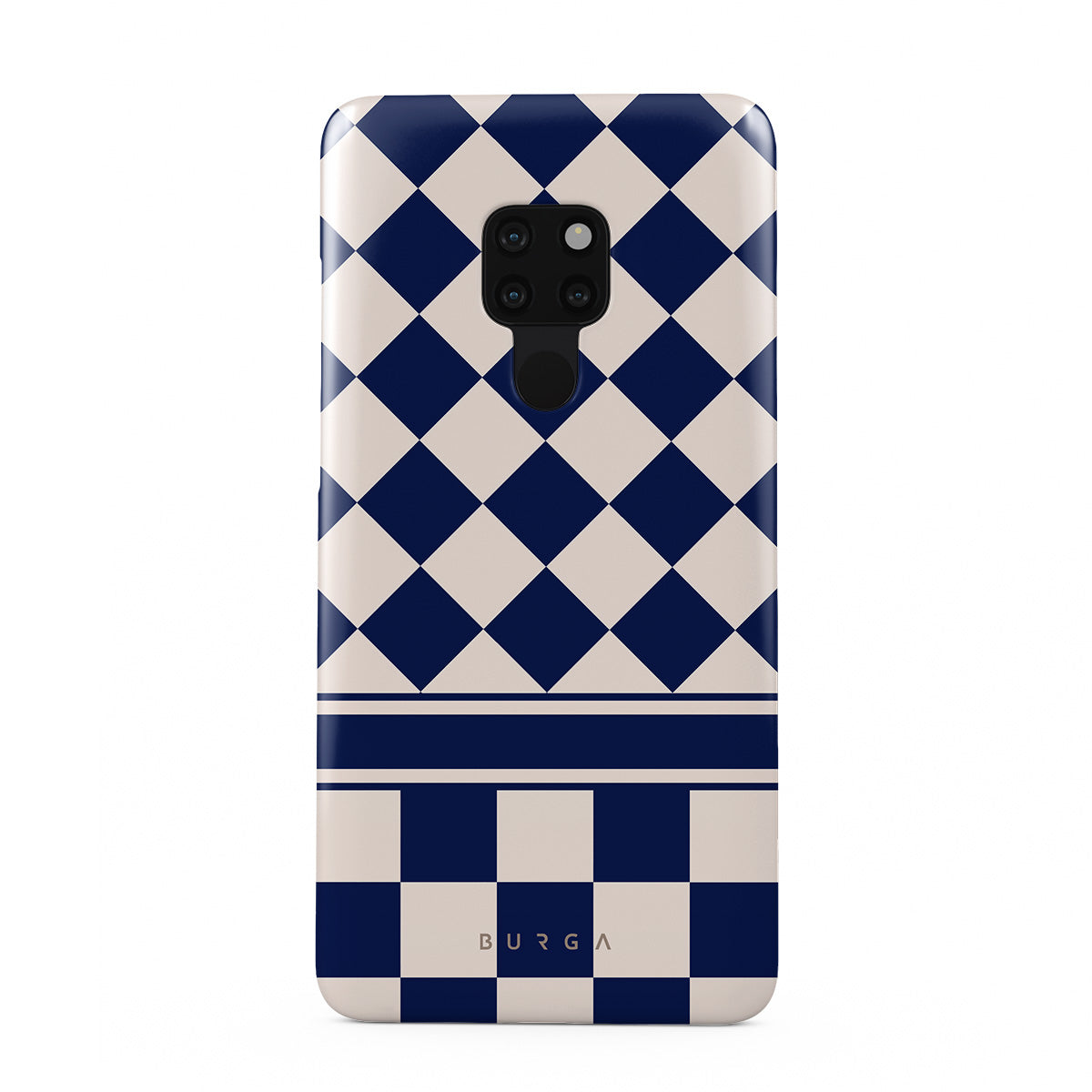 Embrace the essence of subtle luxury with our Check & Mate Huawei Mate 20 phone case design. Blending eggshell and deep blue checkers, it evokes whispers of elegance. While diamonds grace the upper half, the lower half features a timeless chessboard pattern.