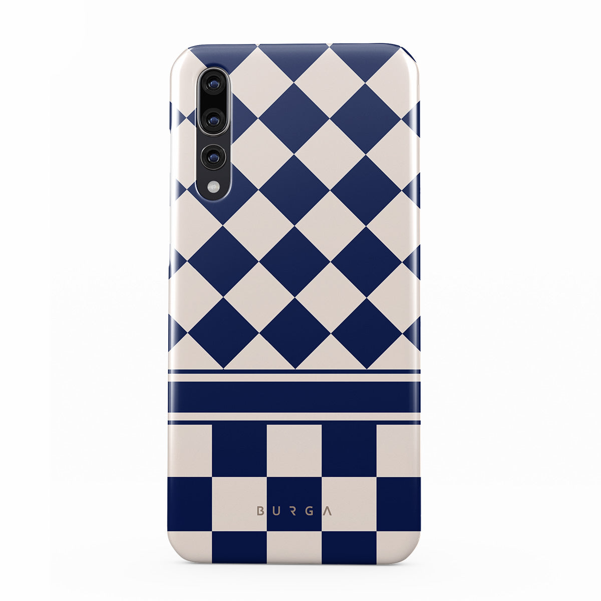 Embrace the essence of subtle luxury with our Check & Mate Huawei P20 phone case design. Blending eggshell and deep blue checkers, it evokes whispers of elegance. While diamonds grace the upper half, the lower half features a timeless chessboard pattern.