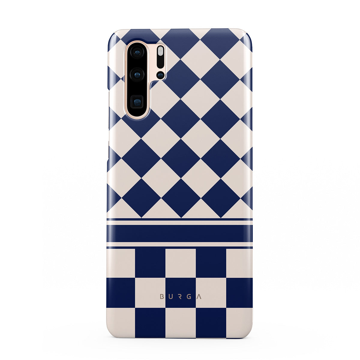 Embrace the essence of subtle luxury with our Check & Mate Huawei P30 Pro phone case design. Blending eggshell and deep blue checkers, it evokes whispers of elegance. While diamonds grace the upper half, the lower half features a timeless chessboard pattern.