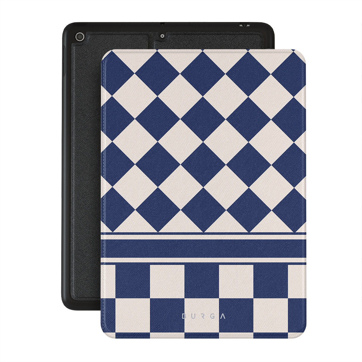 Embrace the essence of subtle luxury with our Check & Mate iPad 10.2 (9th/8th/7th Gen) folio case design. Blending eggshell and deep blue checkers, it evokes whispers of elegance. While diamonds grace the upper half, the lower half features a timeless chessboard pattern.