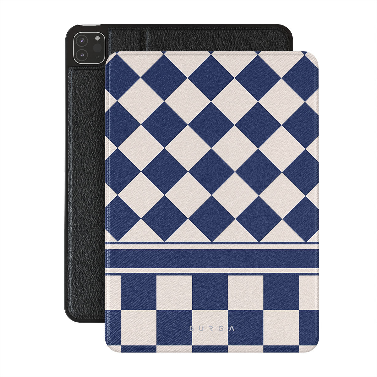 Embrace the essence of subtle luxury with our Check & Mate iPad Pro 12.9 (4th/3rd Gen) folio case design. Blending eggshell and deep blue checkers, it evokes whispers of elegance. While diamonds grace the upper half, the lower half features a timeless chessboard pattern.