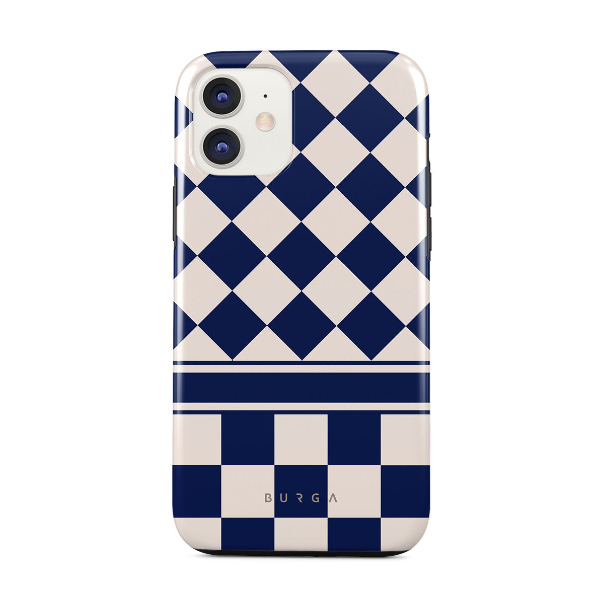 Embrace the essence of subtle luxury with our Check & Mate iPhone 11 phone case design. Blending eggshell and deep blue checkers, it evokes whispers of elegance. While diamonds grace the upper half, the lower half features a timeless chessboard pattern.