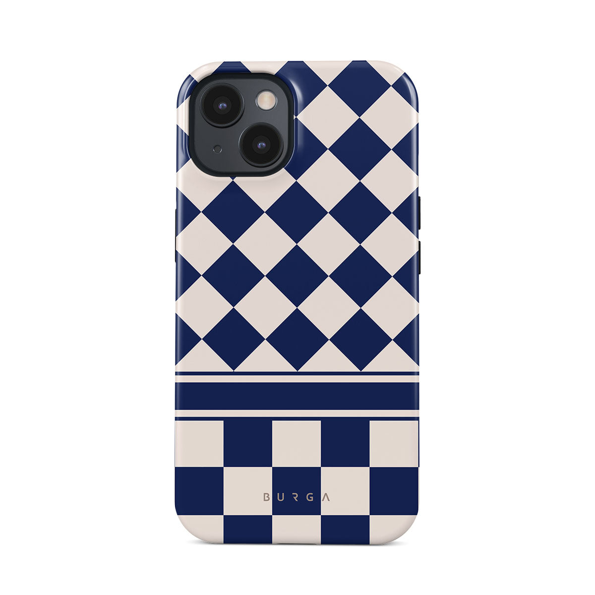 Embrace the essence of subtle luxury with our Check & Mate iPhone 15 phone case design. Blending eggshell and deep blue checkers, it evokes whispers of elegance. While diamonds grace the upper half, the lower half features a timeless chessboard pattern.