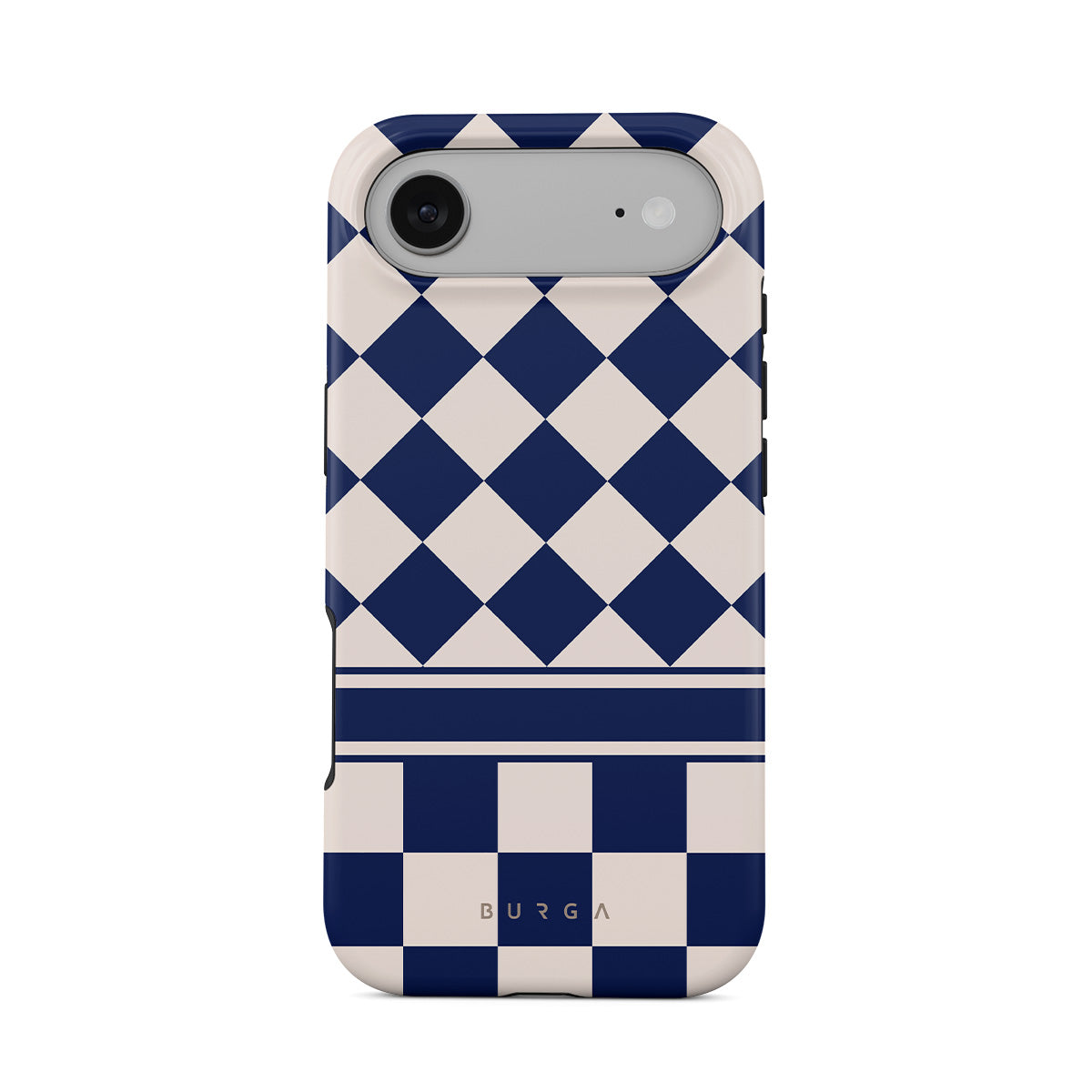 Embrace the essence of subtle luxury with our Check & Mate iPhone Air phone case design. Blending eggshell and deep blue checkers, it evokes whispers of elegance. While diamonds grace the upper half, the lower half features a timeless chessboard pattern.