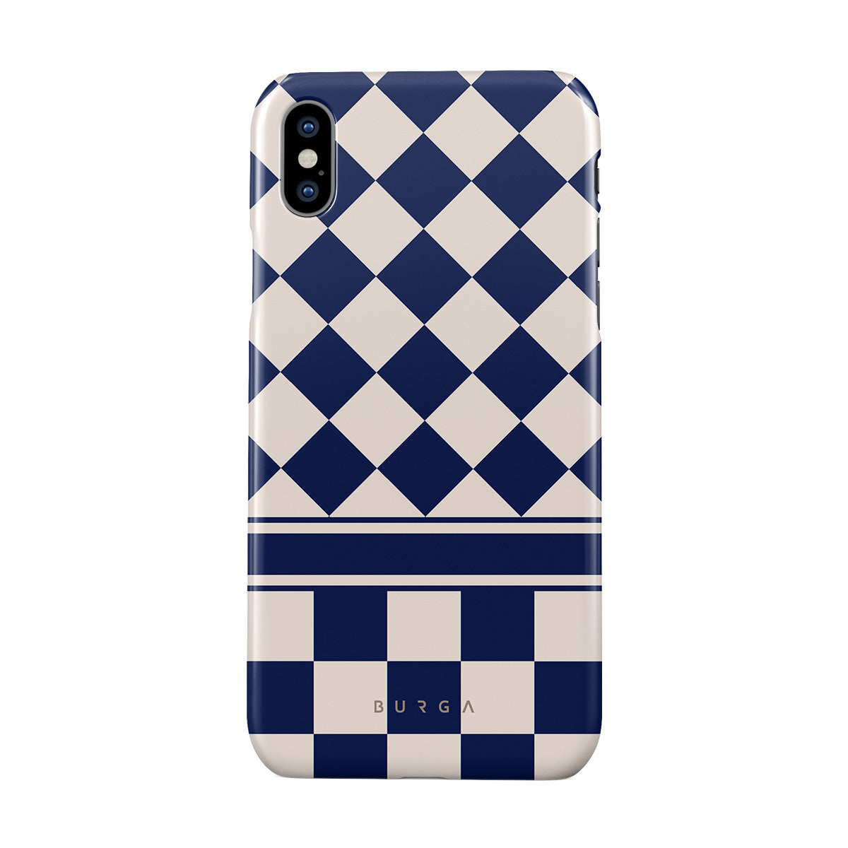Embrace the essence of subtle luxury with our Check & Mate iPhone XS Max phone case design. Blending eggshell and deep blue checkers, it evokes whispers of elegance. While diamonds grace the upper half, the lower half features a timeless chessboard pattern.