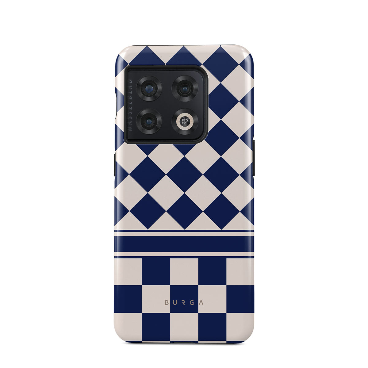 Embrace the essence of subtle luxury with our Check & Mate OnePlus 10 Pro 5G phone case design. Blending eggshell and deep blue checkers, it evokes whispers of elegance. While diamonds grace the upper half, the lower half features a timeless chessboard pattern.