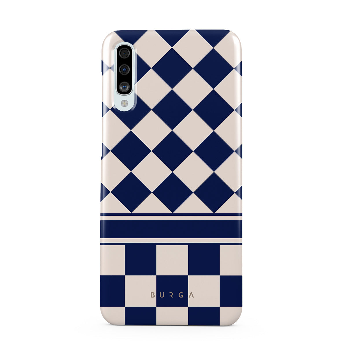 Embrace the essence of subtle luxury with our Check & Mate Samsung Galaxy A50 phone case design. Blending eggshell and deep blue checkers, it evokes whispers of elegance. While diamonds grace the upper half, the lower half features a timeless chessboard pattern.