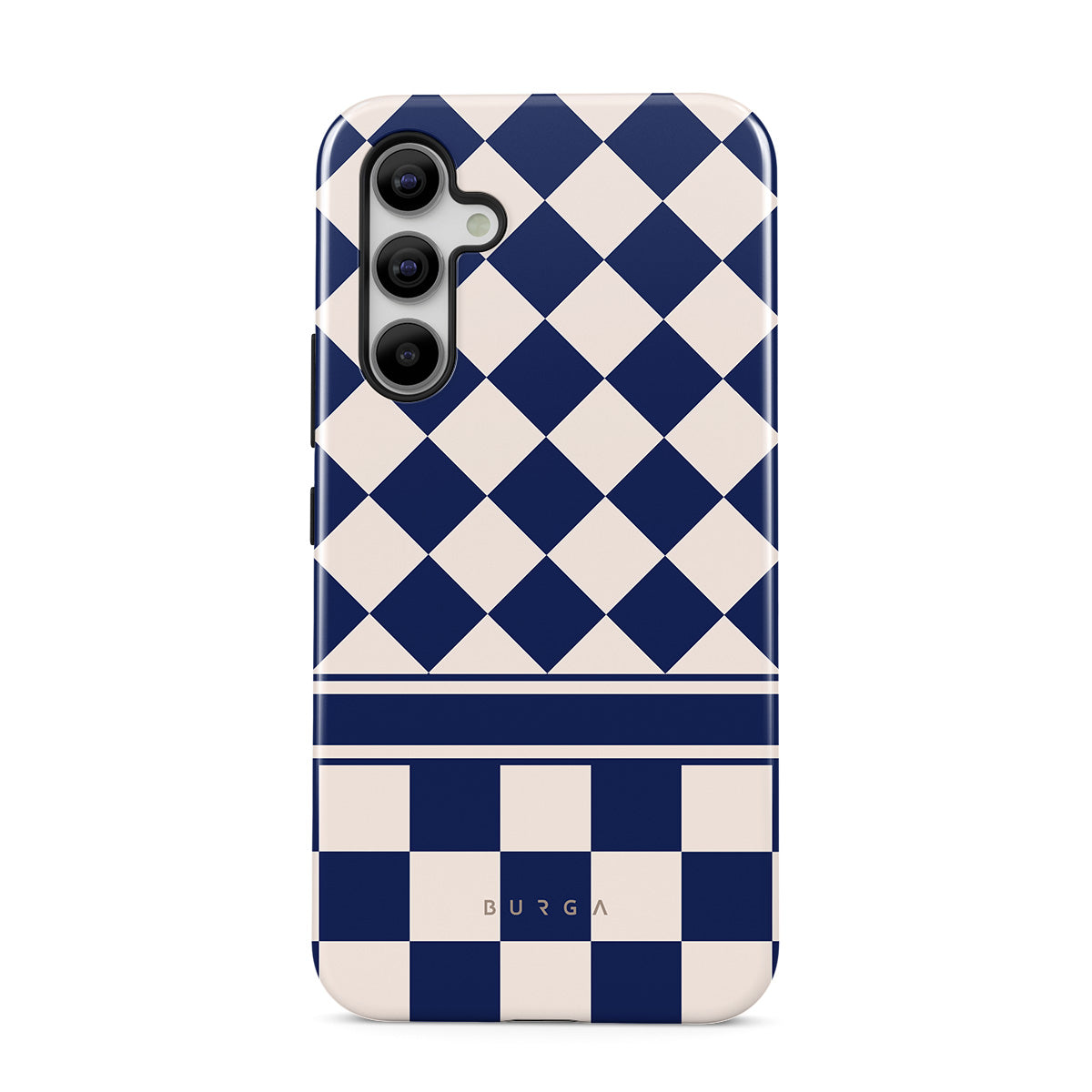 Embrace the essence of subtle luxury with our Check & Mate Samsung Galaxy A54 phone case design. Blending eggshell and deep blue checkers, it evokes whispers of elegance. While diamonds grace the upper half, the lower half features a timeless chessboard pattern.