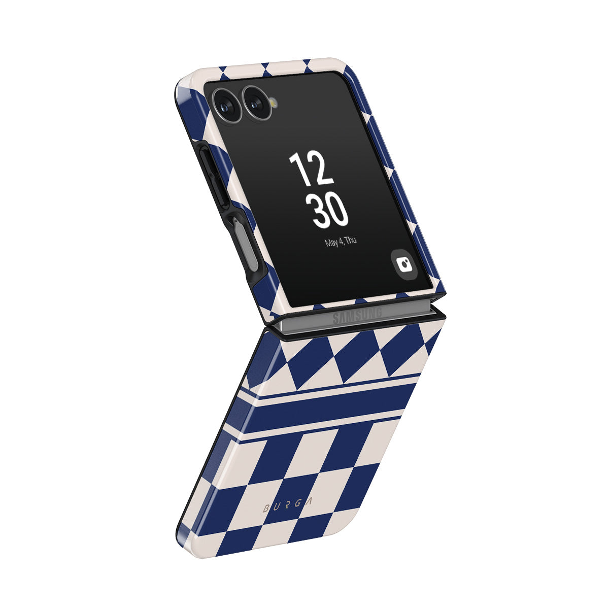 Embrace the essence of subtle luxury with our Check & Mate Samsung Galaxy Z Flip 7 phone case design. Blending eggshell and deep blue checkers, it evokes whispers of elegance. While diamonds grace the upper half, the lower half features a timeless chessboard pattern.