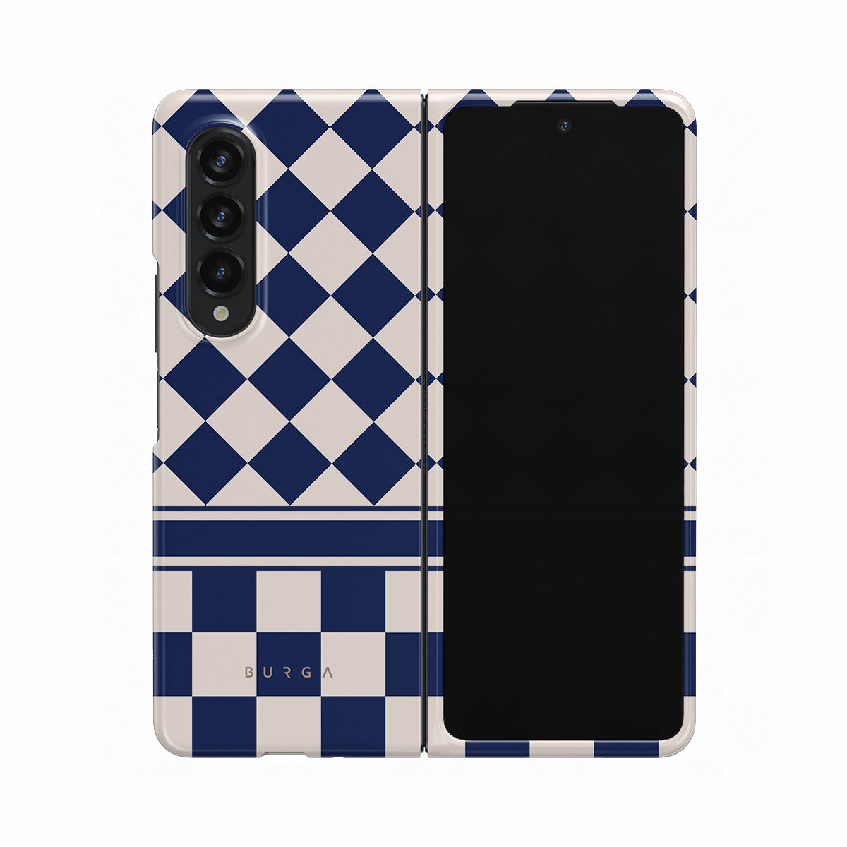 Embrace the essence of subtle luxury with our Check & Mate Samsung Galaxy Z Fold 3 phone case design. Blending eggshell and deep blue checkers, it evokes whispers of elegance. While diamonds grace the upper half, the lower half features a timeless chessboard pattern.