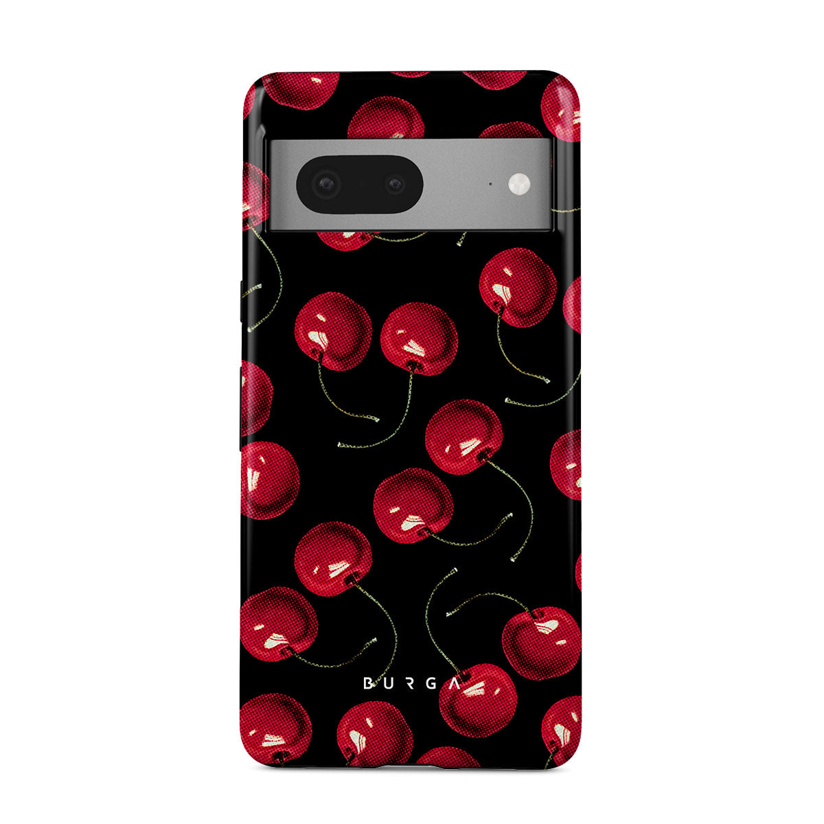 On a deep black background, rich red cherries stand out. Tempting and audacious, our Cherrybomb Google Pixel 7a phone case design is perfect for anyone who likes to keep things simple yet striking.