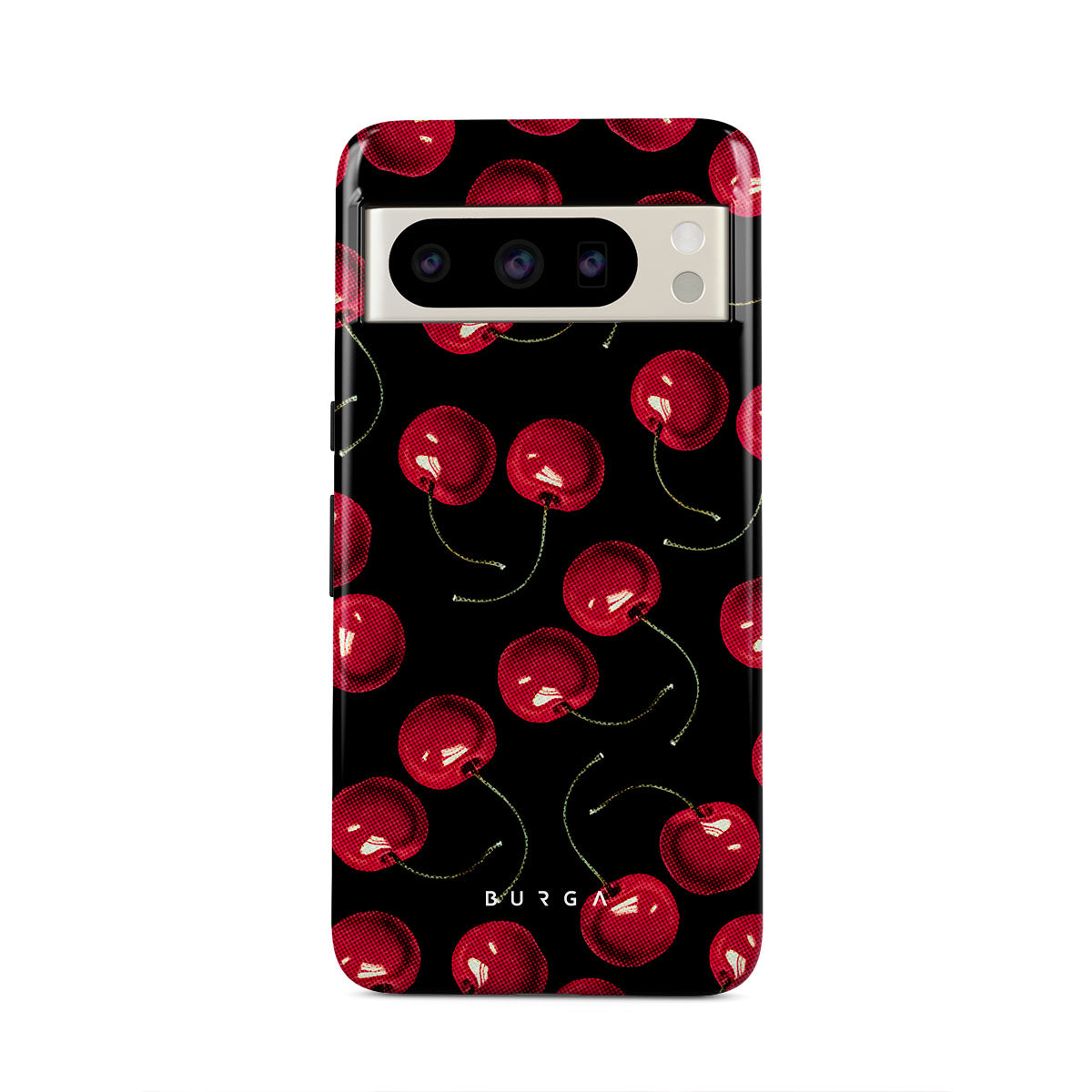 On a deep black background, rich red cherries stand out. Tempting and audacious, our Cherrybomb Google Pixel 8 Pro phone case design is perfect for anyone who likes to keep things simple yet striking.