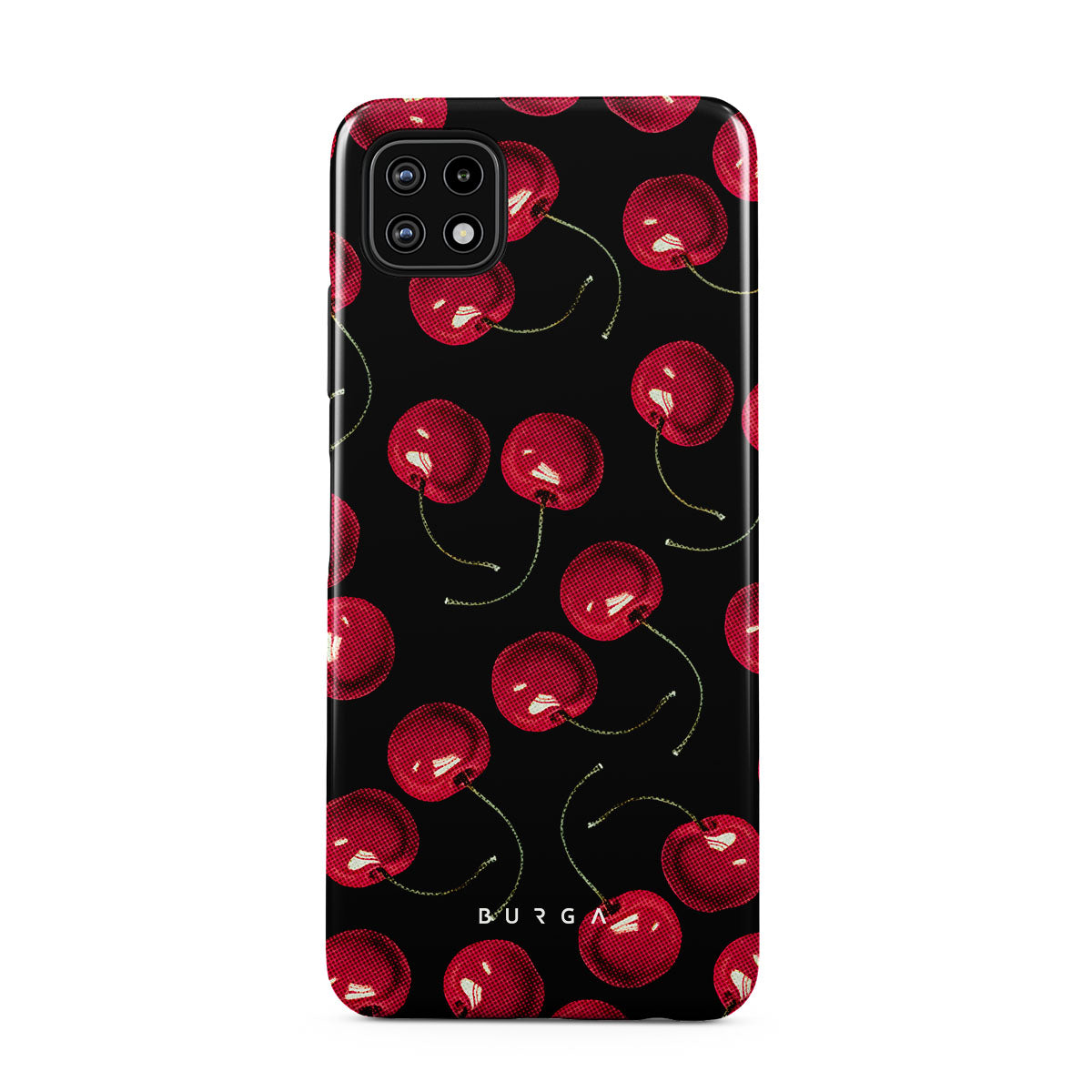 On a deep black background, rich red cherries stand out. Tempting and audacious, our Cherrybomb Samsung Galaxy A22 5G phone case design is perfect for anyone who likes to keep things simple yet striking.