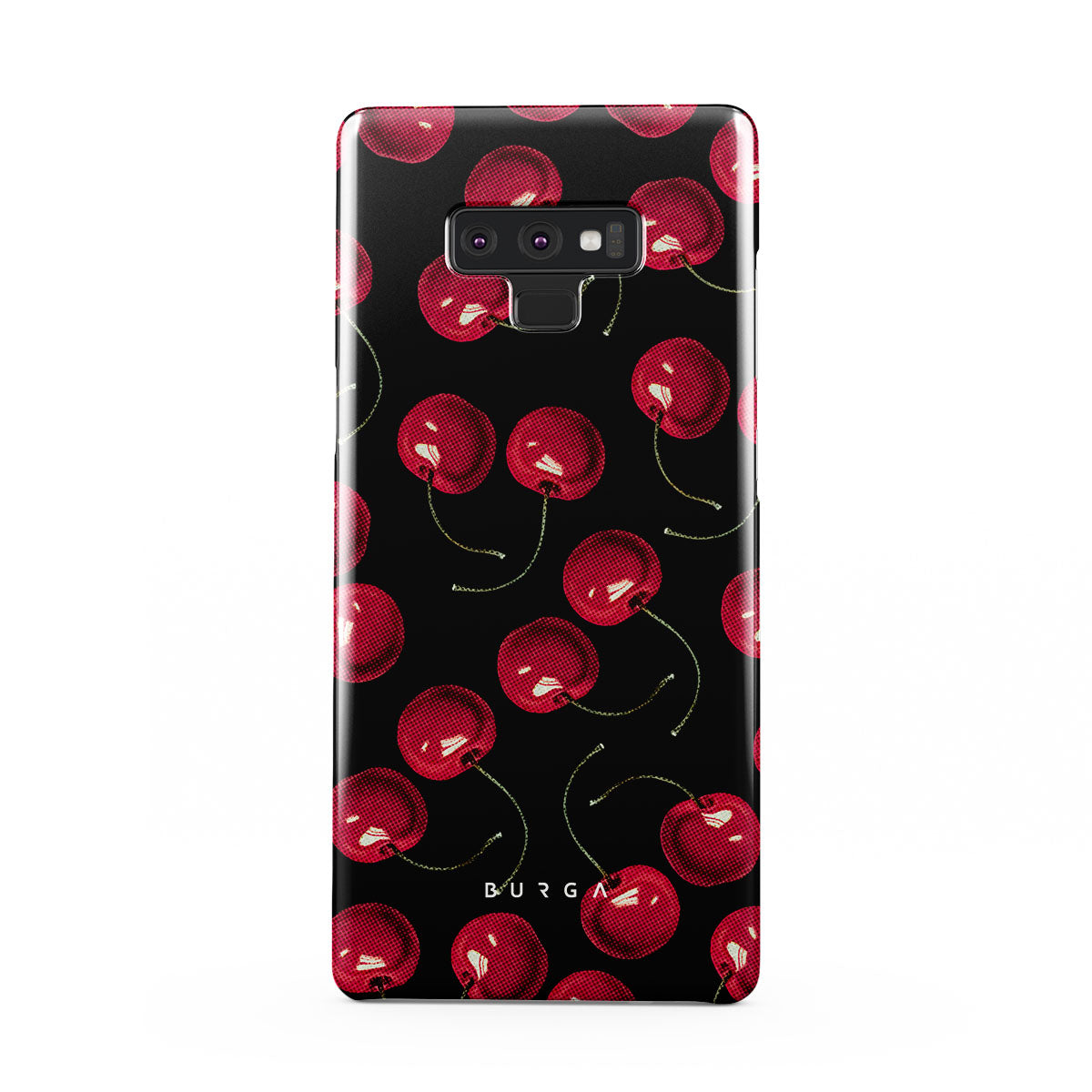 On a deep black background, rich red cherries stand out. Tempting and audacious, our Cherrybomb Samsung Galaxy Note 9 phone case design is perfect for anyone who likes to keep things simple yet striking.