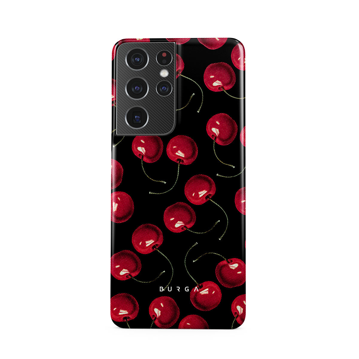 On a deep black background, rich red cherries stand out. Tempting and audacious, our Cherrybomb Samsung Galaxy S21 Ultra phone case design is perfect for anyone who likes to keep things simple yet striking.