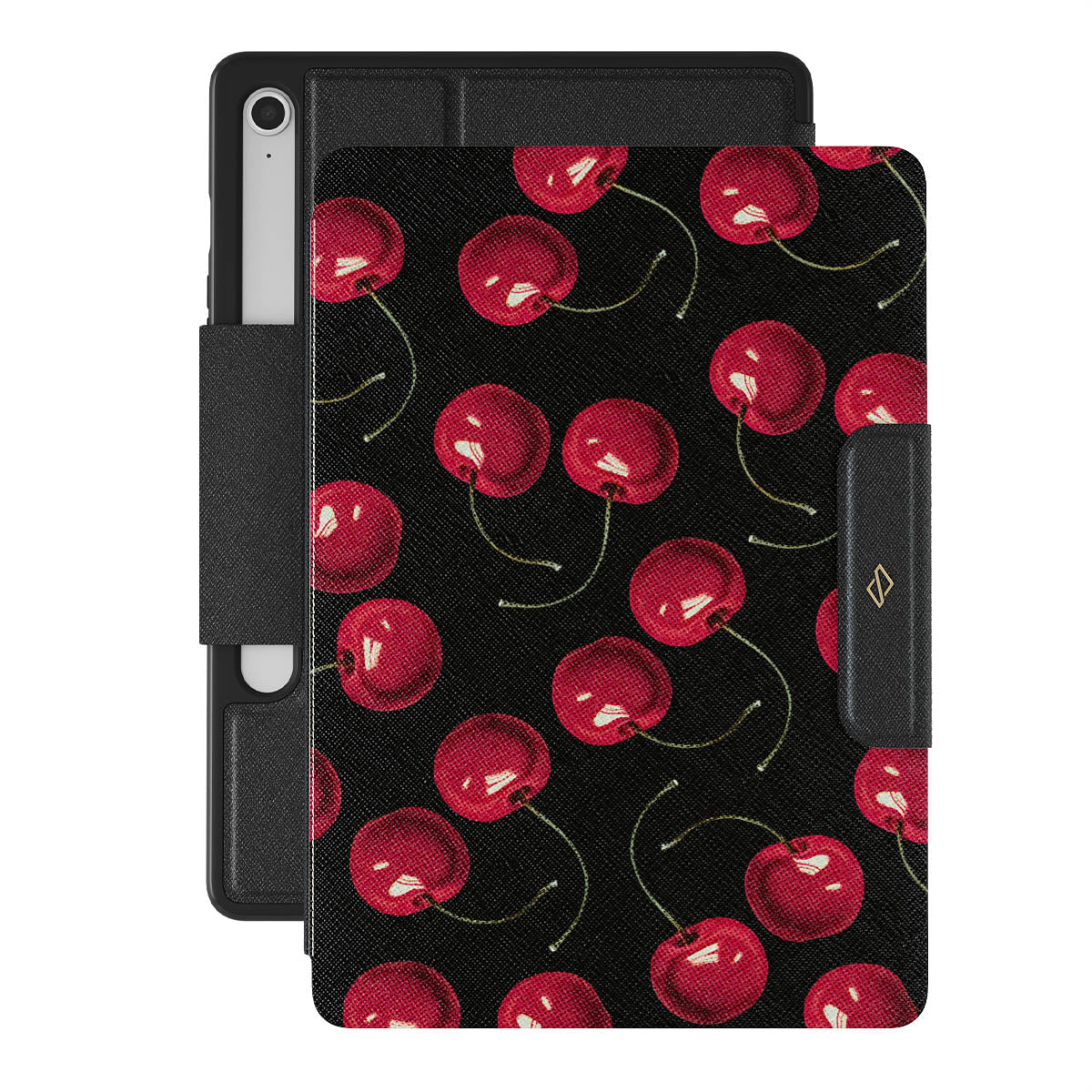 On a deep black background, rich red cherries stand out. Tempting and audacious, our Cherrybomb Samsung Galaxy Tab S10 FE folio case design is perfect for anyone who likes to keep things simple yet striking.