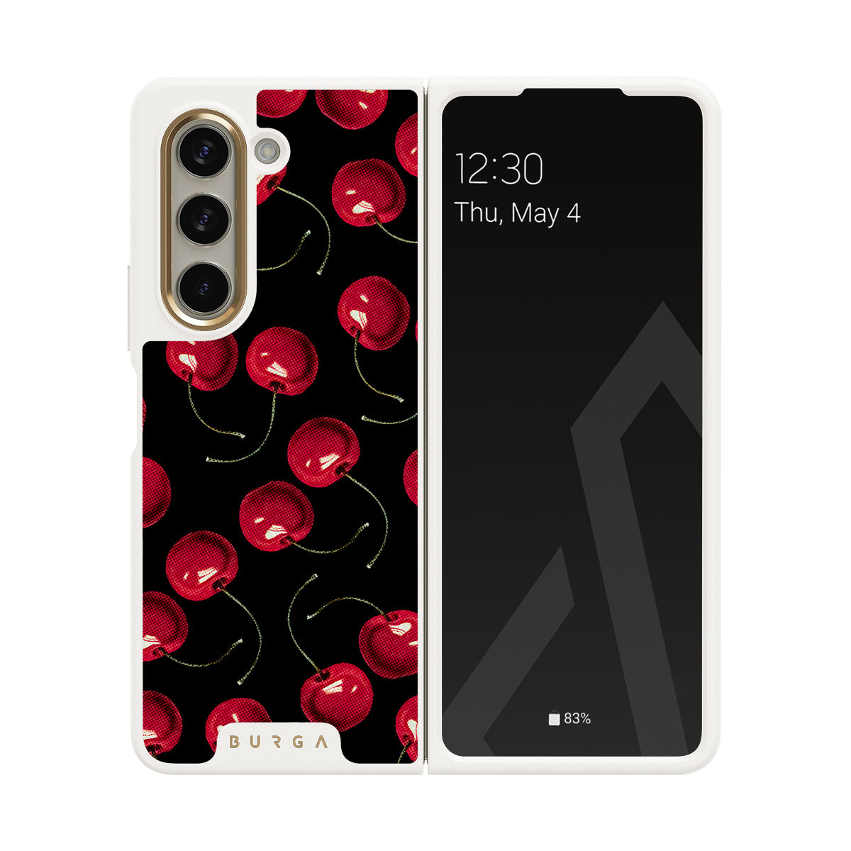 On a deep black background, rich red cherries stand out. Tempting and audacious, our Cherrybomb Samsung Galaxy Z Fold 5 phone case design is perfect for anyone who likes to keep things simple yet striking.