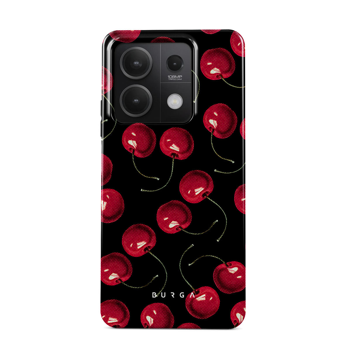 On a deep black background, rich red cherries stand out. Tempting and audacious, our Cherrybomb Xiaomi Redmi Note 13 5G phone case design is perfect for anyone who likes to keep things simple yet striking.