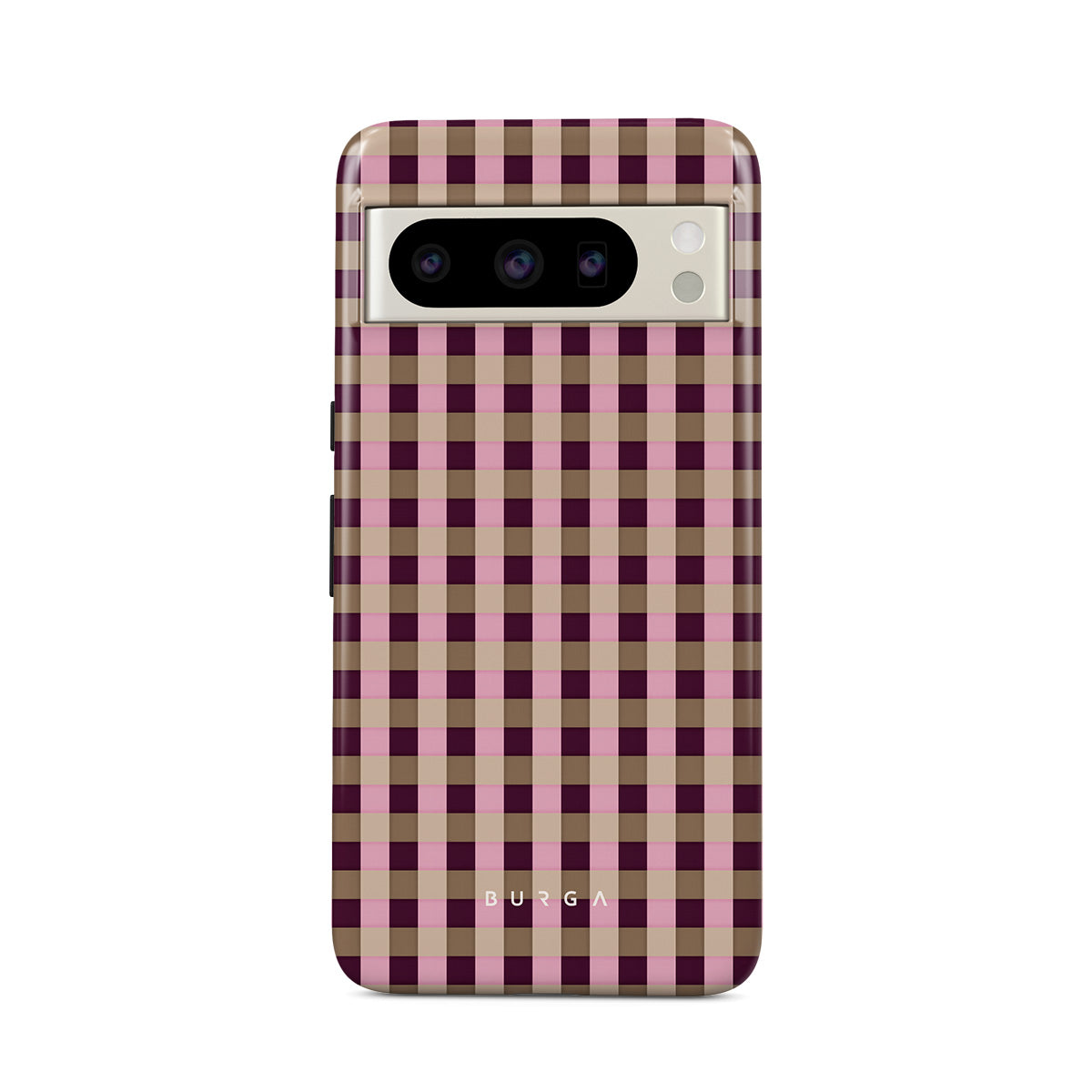 This design features: pink and burgundy plaid pattern, modern checkered style.