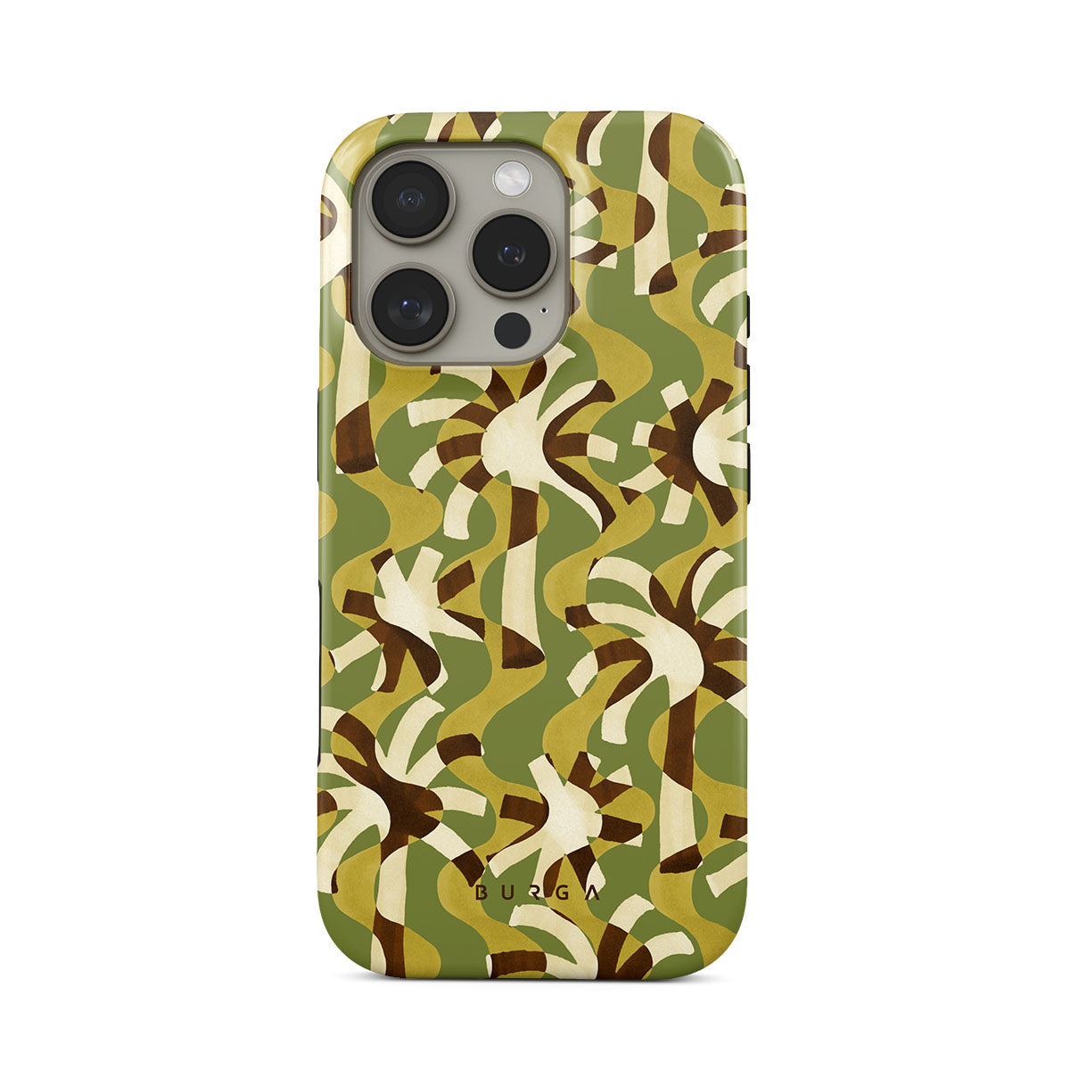 A leafy blur of tropical motion. This iPhone 16 Pro Max phone case design feels like a memory of a rainforest walk you never took, but wish you had. Hot, hazy, and happily lost.