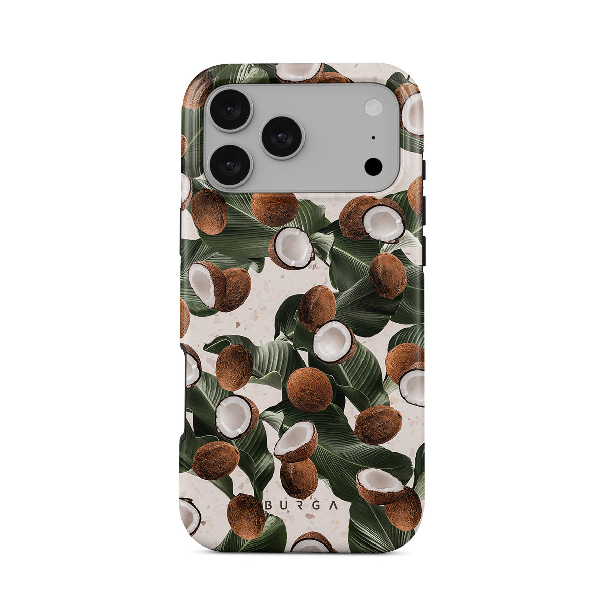 Coconut Crush iPhone 17 Pro Max phone case showcases a soft creme color design with a playful addition of coconuts on top. The unexpected design duo will add a touch of tropical playfulness to your style while offering heavy-duty protection for your cell phone.