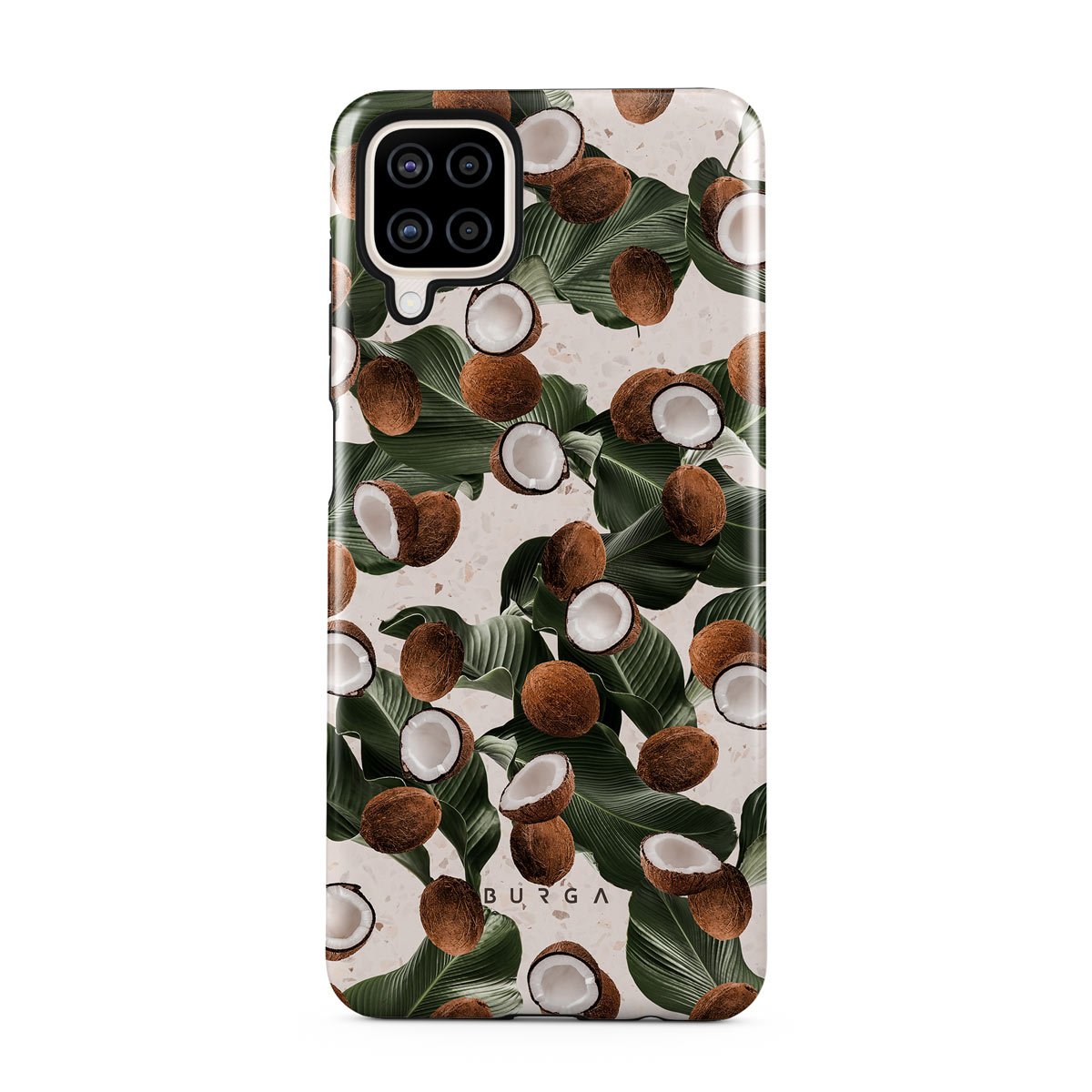 Coconut Crush Samsung Galaxy A12 4G phone case showcases a soft creme color design with a playful addition of coconuts on top. The unexpected design duo will add a touch of tropical playfulness to your style while offering heavy-duty protection for your cell phone.
