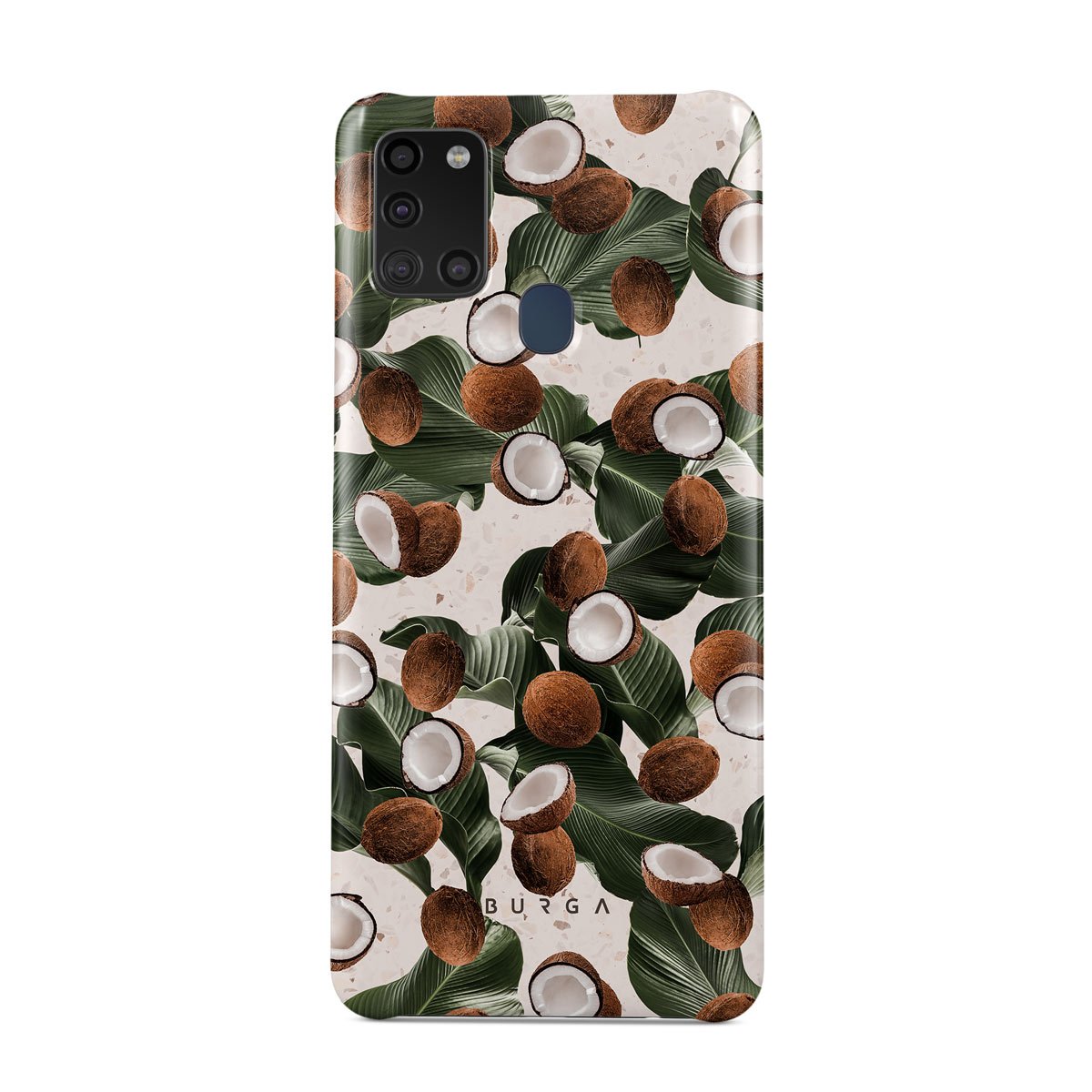 Coconut Crush Samsung Galaxy A21s 4G phone case showcases a soft creme color design with a playful addition of coconuts on top. The unexpected design duo will add a touch of tropical playfulness to your style while offering heavy-duty protection for your cell phone.