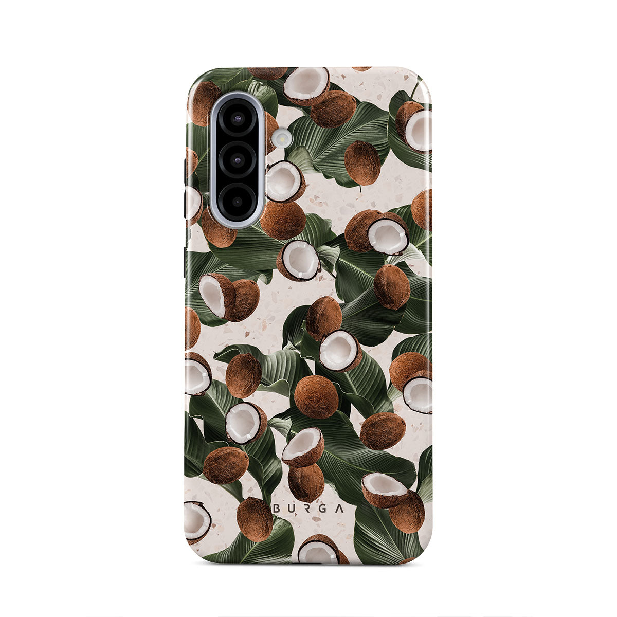 Coconut Crush Samsung Galaxy A36 5G phone case showcases a soft creme color design with a playful addition of coconuts on top. The unexpected design duo will add a touch of tropical playfulness to your style while offering heavy-duty protection for your cell phone.