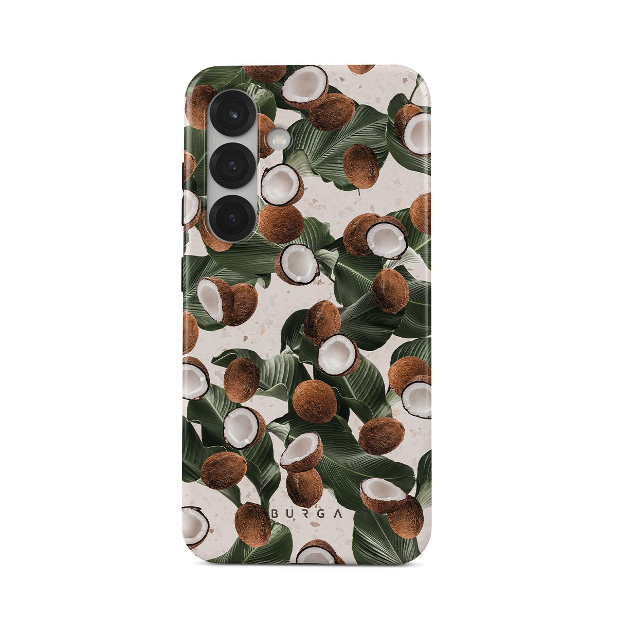 Coconut Crush Samsung Galaxy S25 phone case showcases a soft creme color design with a playful addition of coconuts on top. The unexpected design duo will add a touch of tropical playfulness to your style while offering heavy-duty protection for your cell phone.
