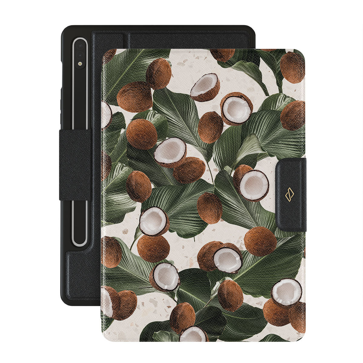 Coconut Crush Samsung Galaxy Tab S10+ folio case showcases a soft creme color design with a playful addition of coconuts on top. The unexpected design duo will add a touch of tropical playfulness to your style while offering heavy-duty protection for your cell Galaxy Tab.