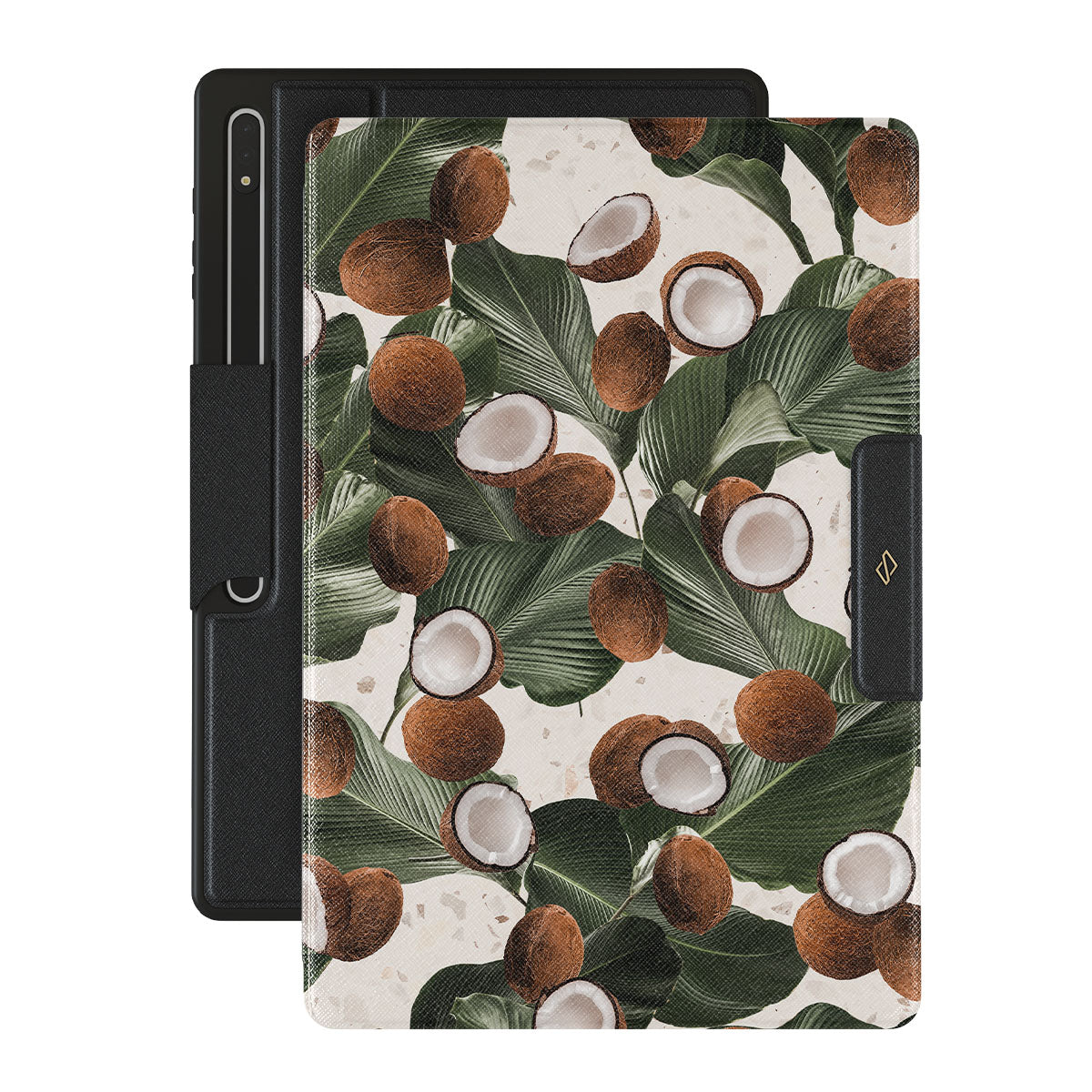 Coconut Crush Samsung Galaxy Tab S8 Ultra folio case showcases a soft creme color design with a playful addition of coconuts on top. The unexpected design duo will add a touch of tropical playfulness to your style while offering heavy-duty protection for your cell Galaxy Tab.
