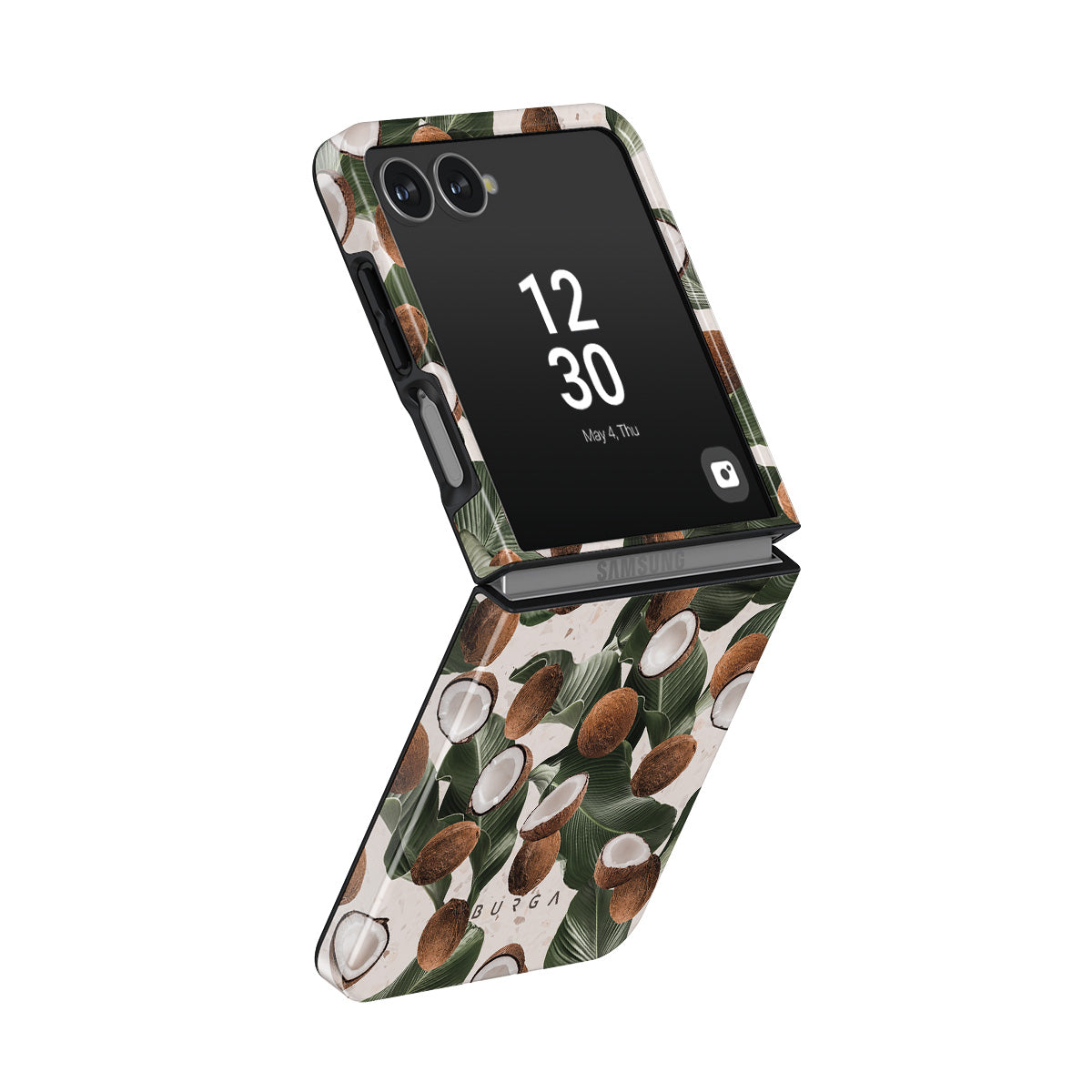 Coconut Crush Samsung Galaxy Z Flip 7 phone case showcases a soft creme color design with a playful addition of coconuts on top. The unexpected design duo will add a touch of tropical playfulness to your style while offering heavy-duty protection for your cell phone.