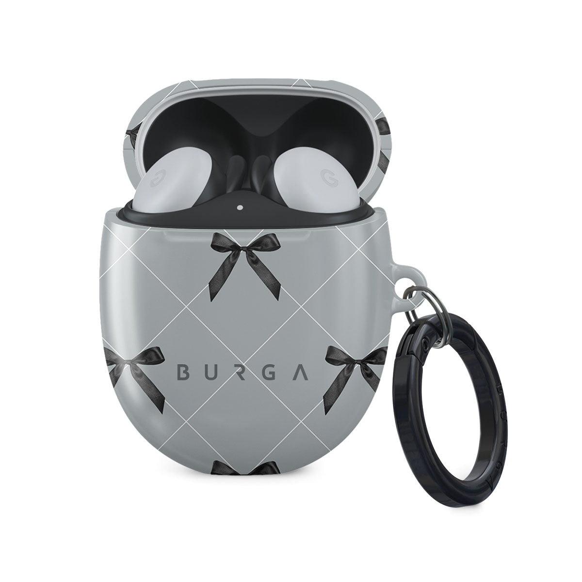 A subtle hint to a world of dance and soft melodies. Crisscrossing bows over a muted gray tone capture the flirtatious essence of the coquette-core aesthetic. Playful and sweet, our Coquette Google Pixel Buds 2 case cover design is perfect for those who find beauty in the details.