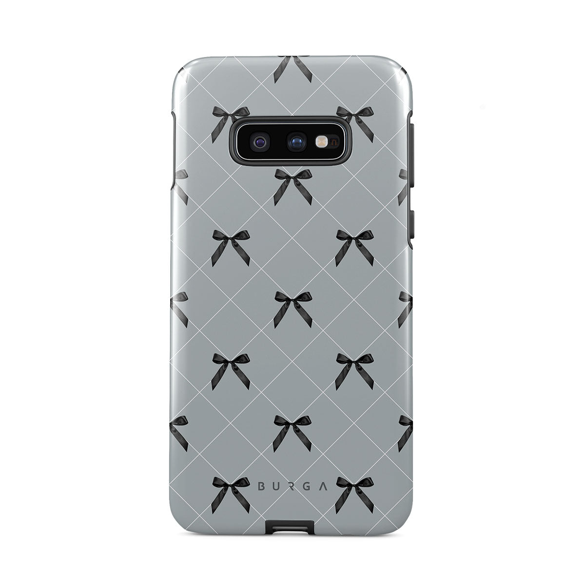 A subtle hint to a world of dance and soft melodies. Crisscrossing bows over a muted gray tone capture the flirtatious essence of the coquette-core aesthetic. Playful and sweet, our Coquette Samsung Galaxy S10E phone case design is perfect for those who find beauty in the details.