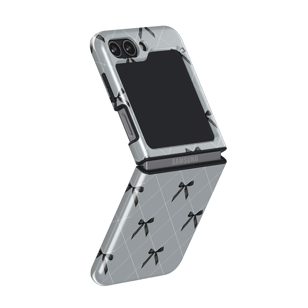 A subtle hint to a world of dance and soft melodies. Crisscrossing bows over a muted gray tone capture the flirtatious essence of the coquette-core aesthetic. Playful and sweet, our Coquette Samsung Galaxy Z Flip 5 phone case design is perfect for those who find beauty in the details.