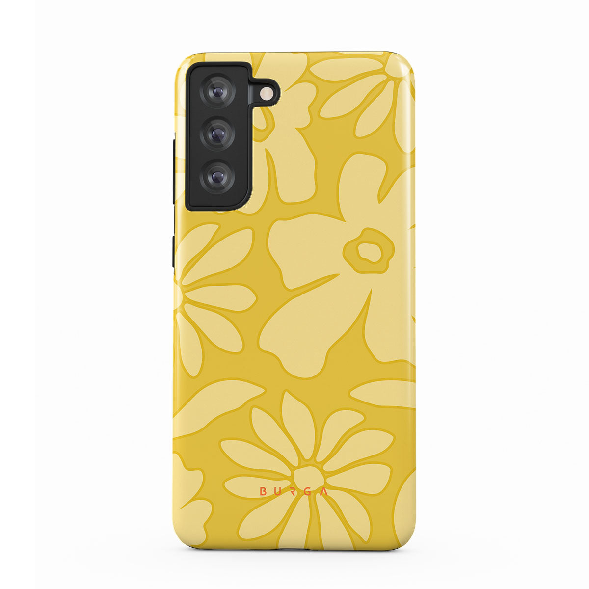 Our bright yellow Samsung Galaxy S21 FE phone case features bold, beautiful flowers that evoke a sense of nostalgia and happiness. This cheerful floral design captures the essence of joyful moments, making your device a reminder of sunny memories. Perfect for brightening up your day.